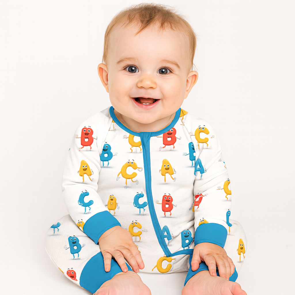 Our ABCs print bounces with cheerful alphabet pals—A, B, and C dancing across every cuddle.