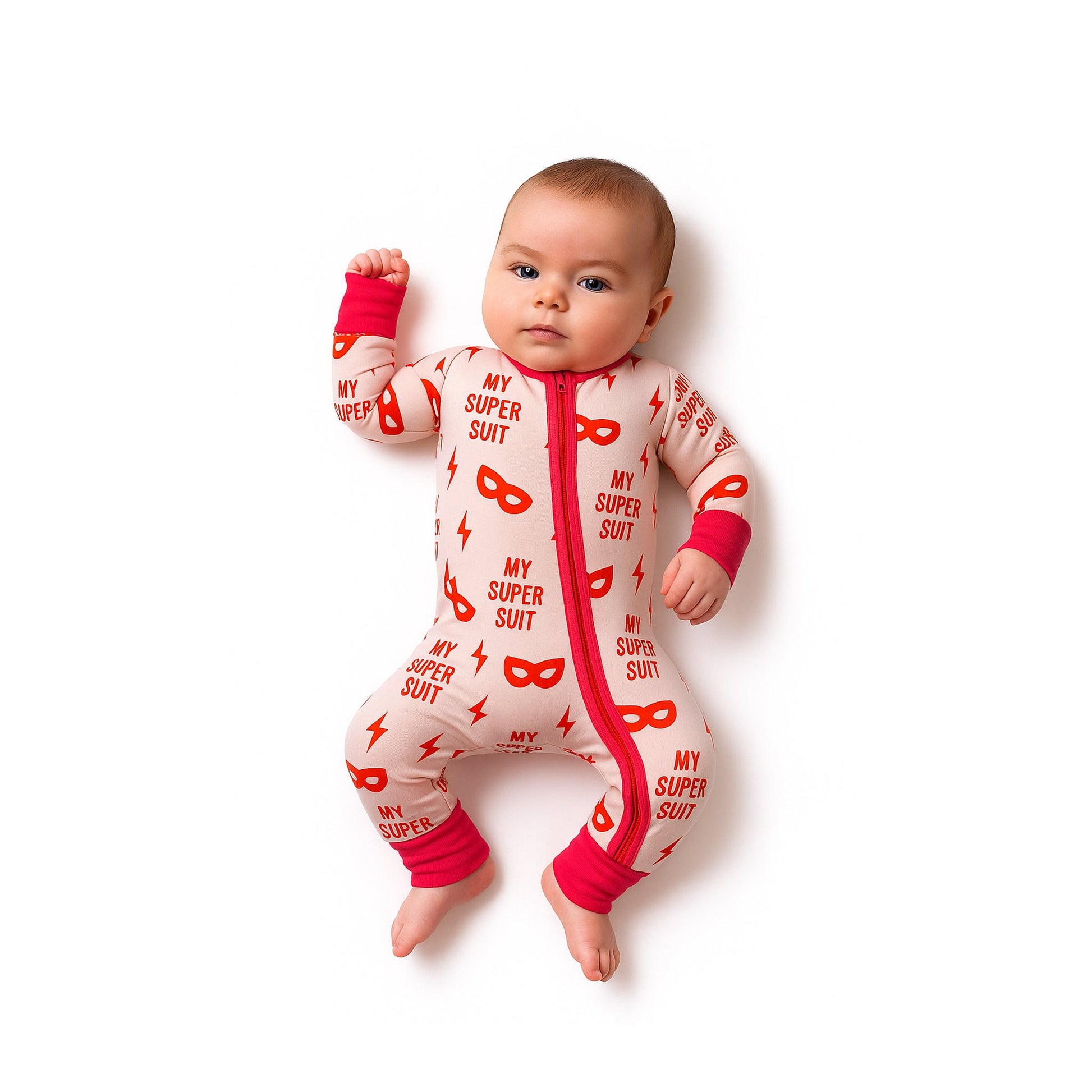 Our Super Suit print powers up with bold masks, lightning bolts, and “My Super Suit” callouts—made for tiny heroes in training.